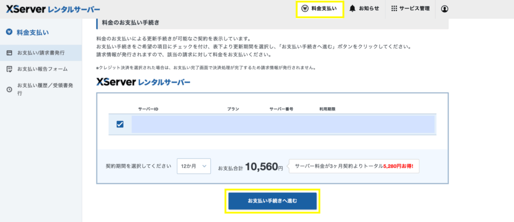 ページを下にスクロールすると、登録済みのサーバーIDが表示されます。 該当のサーバーIDにチェックを入れて、「お支払い手続きへ進む」をクリックします。