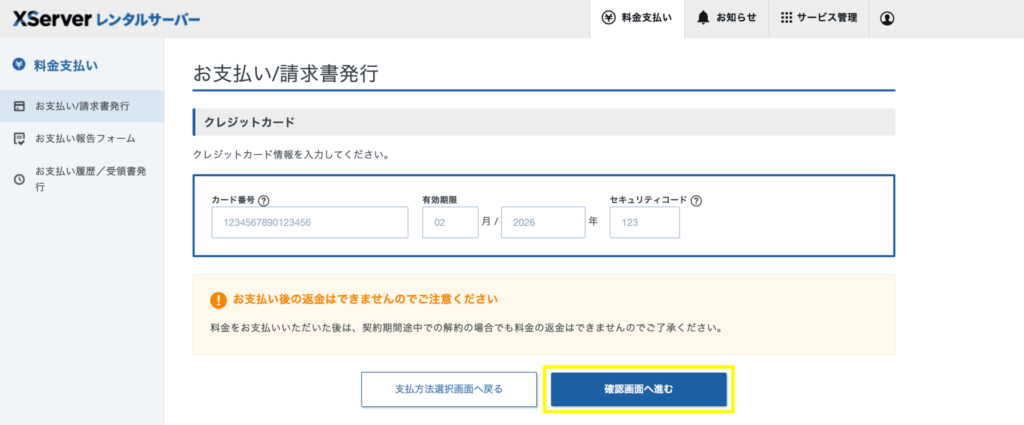 エックスサーバーでクレジットカードで決済する手順