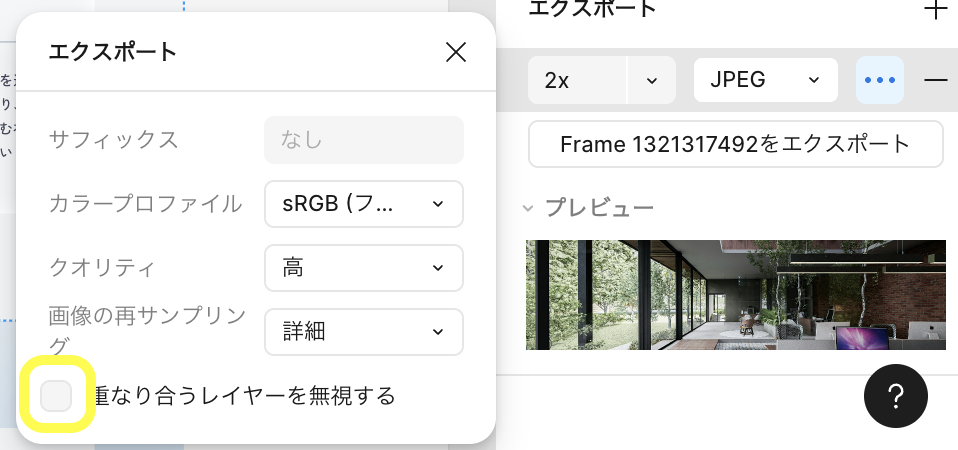 エクスポート欄の「…」をクリックすると、「重なり合うレイヤーを無視する」 にチェックが入っていました。